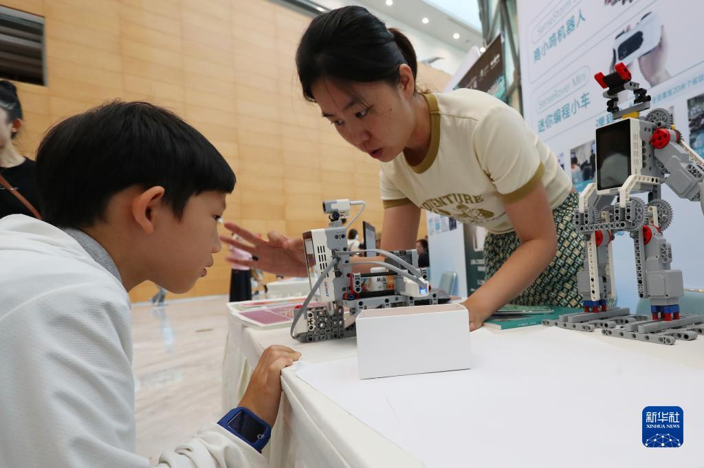 6月30日,工作人员(右)在上海自然博物馆内举行的“科创教育集市”上向小朋友介绍一款带有编程功能的图像识别装置。