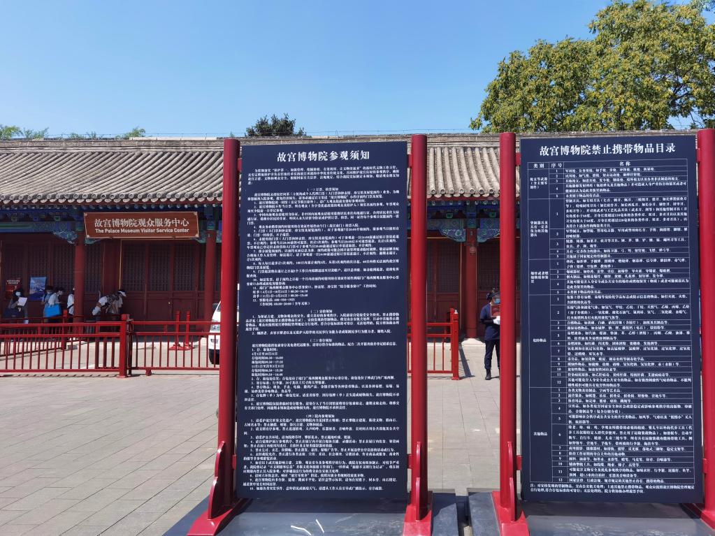 故宫博物院观众服务中心前,印有《故宫博物院参观须知》《故宫博物院禁止携带物品目录》的两块公告牌竖立在醒目位置。这两项内容已于6月15日向社会公告,6月30日是新规施行的第一天。观众还可以在故宫博物院官方网站、“故宫博物院”微信小程序上随时查阅相关细则。