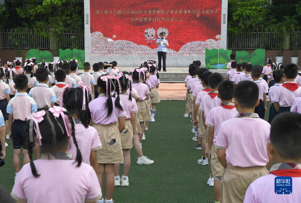 6月30日,民警在广西南宁市玉兰路小学科普暑期预防未成年人意外伤害知识。