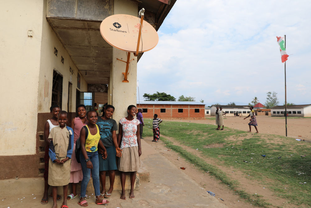 2022年10月31日,在布隆迪布琼布拉乡村省穆蒂姆布齐的一座村庄,当地村民与中国援建布隆迪“万村通”项目安装的卫星电视接收器合影。新华社记者 董江辉 摄
