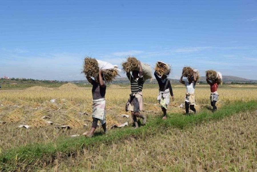 2023年5月12日,在马达加斯加首都塔那那利佛附近马希奇镇的中国国家杂交水稻工程技术研究中心非洲分中心,当地农民在杂交水稻高产示范田内收割水稻。新华社发(西塔卡·拉乔纳里松摄)