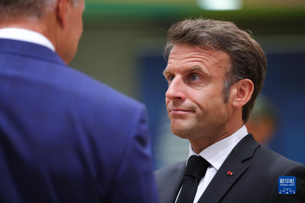6月29日,在比利时布鲁塞尔,法国总统马克龙(右)准备出席欧盟峰会。新华社记者 郑焕松 摄