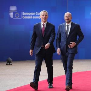 6月29日,在比利时布鲁塞尔,欧洲理事会主席米歇尔(右)与北约秘书长斯托尔滕贝格抵达欧盟总部准备出席欧盟峰会。新华社记者 郑焕松 摄