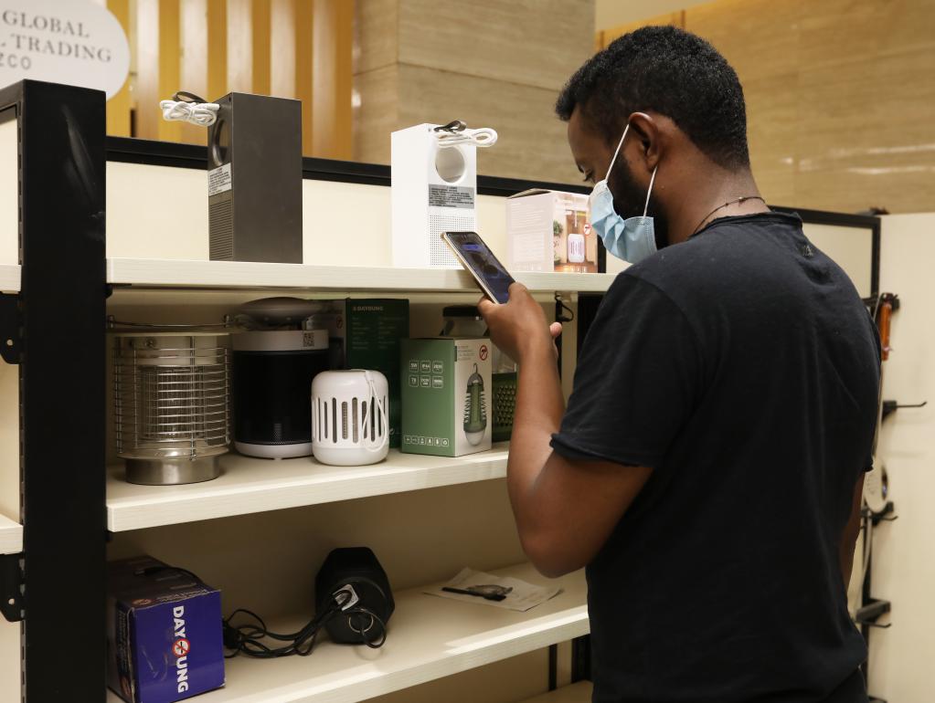 2022年9月14日,在吉布提国际自贸区,一名非洲创业青年用手机查看跨境电商平台商品。新华社记者董江辉摄