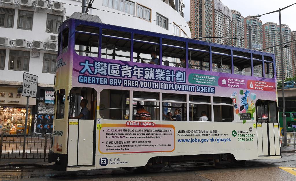 这是6月24日拍摄的涂装“大湾区青年就业计划”宣传海报的电车。新华社记者 陈铎 摄
