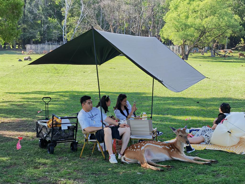 在位于黑龙江省哈尔滨市的平山皇家鹿苑旅游区,蓝天白云,清风徐徐,小鹿悠闲地趴在正在露营的游客脚下,有的游客在品味美食、欣赏美景,有的游客投喂羊驼、抚摸梅花鹿,“露营+亲近动物”让人与动物和谐相处。