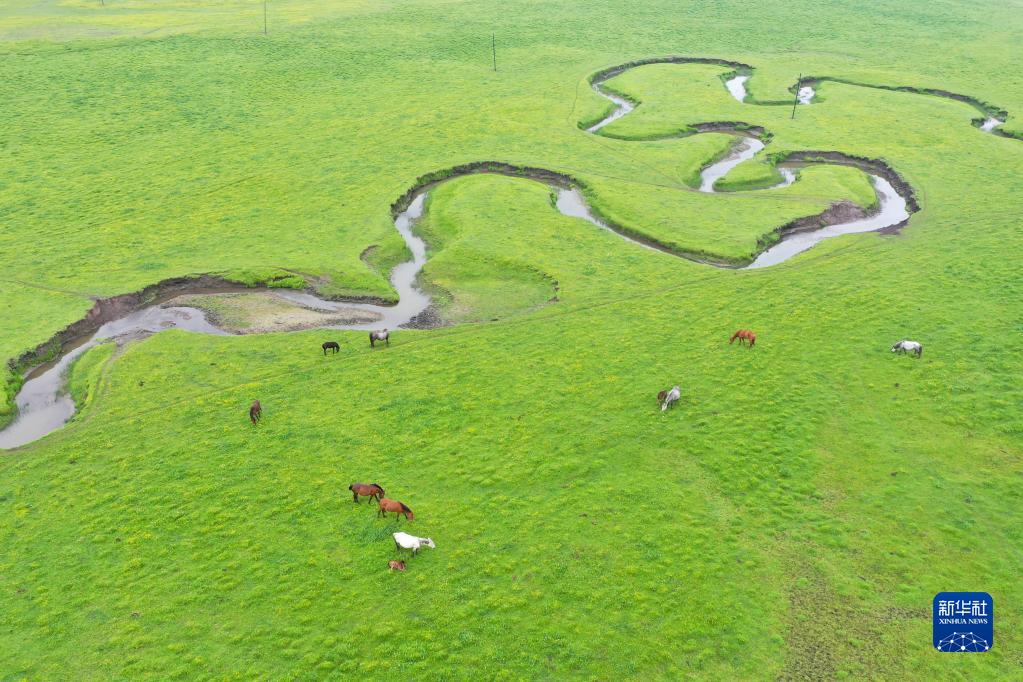 当下,甘肃省定西市岷县狼渡滩草原水草丰茂,曲折蜿蜒的河流静静流淌,岸边牛羊漫步,原野骏马驰骋,构成一幅壮美的画卷。