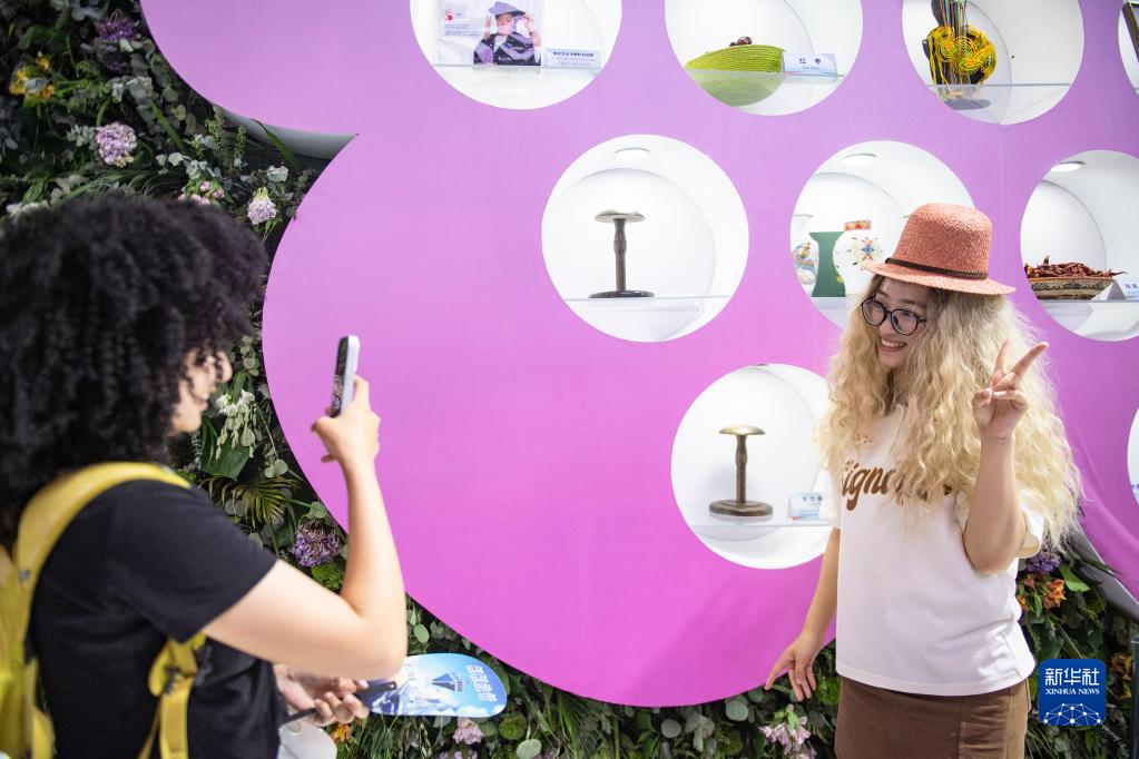 7月1日,观众在博览会上佩戴着假发产品拍照留念。