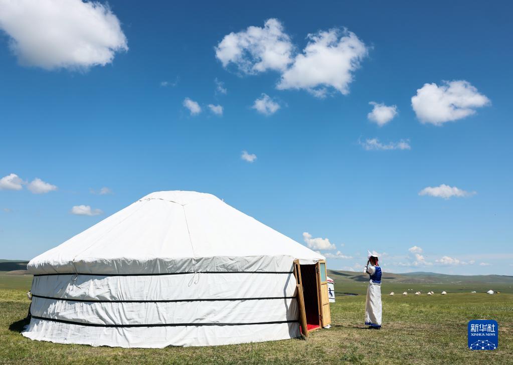 7月1日,一名参加开幕式的礼仪人员在蒙古包外。