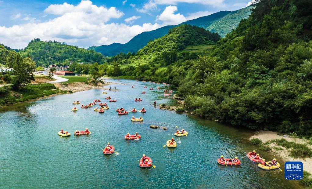 7月1日,人们在贵州省黔南布依族苗族自治州贵定县洛北河体育公园漂流(无人机照片)。