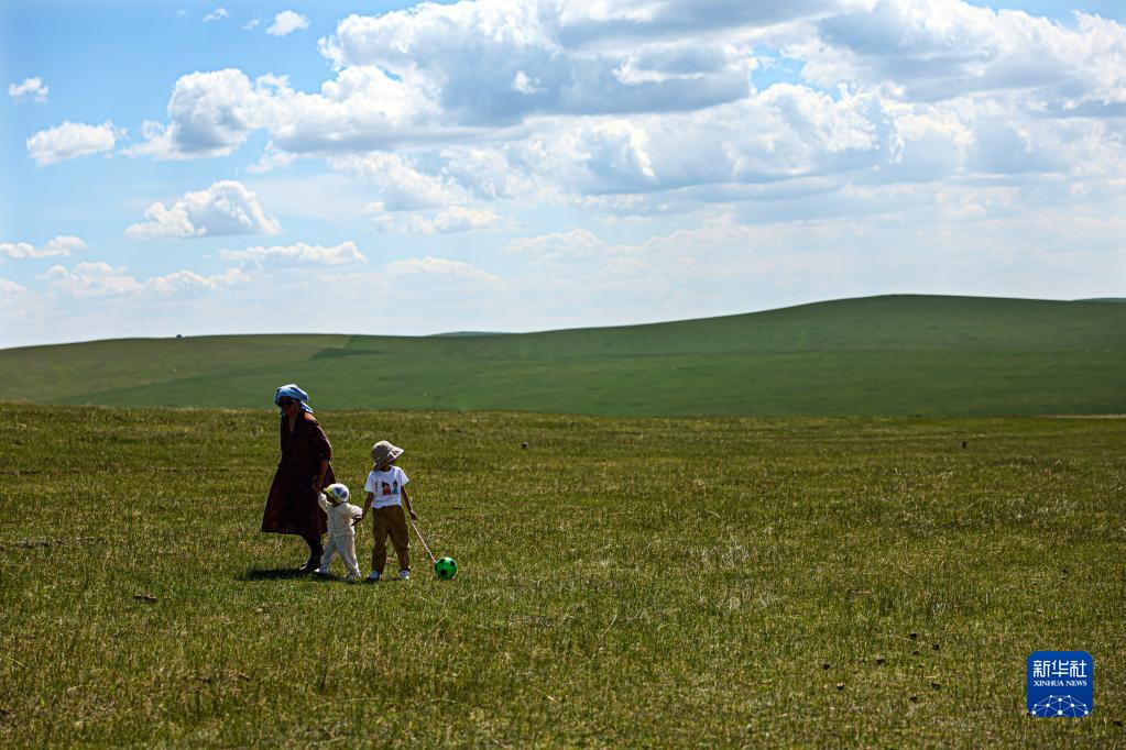 7月1日,在呼伦贝尔市陈巴尔虎旗,一位牧民带着孩子们行走在草原上。