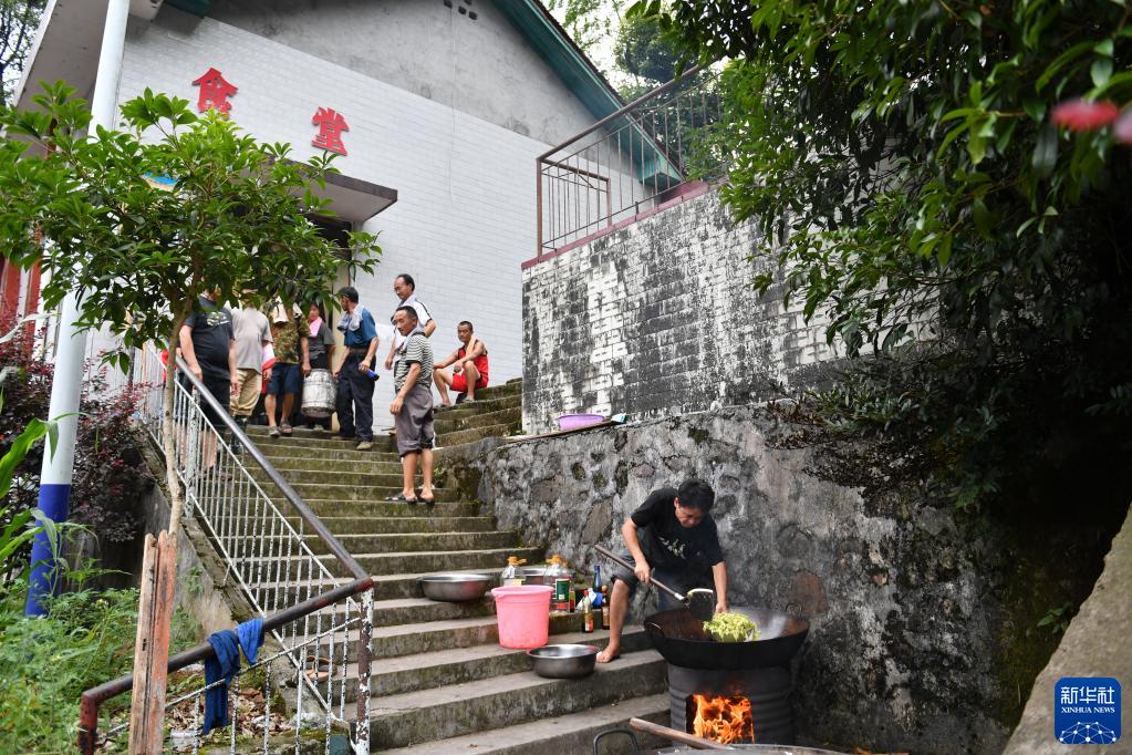 7月2日,村民在湖南省湘西土家族苗族自治州古丈县岩头寨镇草潭村一学校内集中用餐。