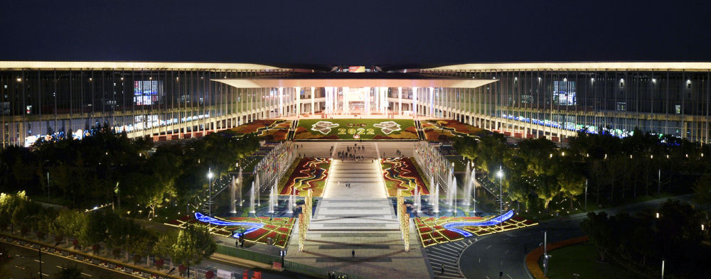 2022年11月5日至10日,第五届中国国际进口博览会在国家会展中心(上海)举行。这是11月5日拍摄的国家会展中心(上海)夜景。新华社记者 刘颖 摄