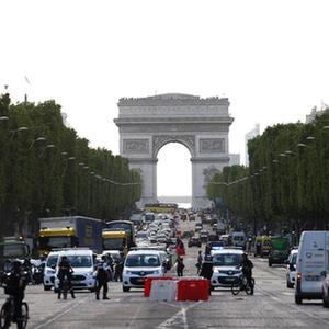 7月2日,在法国巴黎香榭丽舍大道上,工人为一家奢侈品店安装防护板。