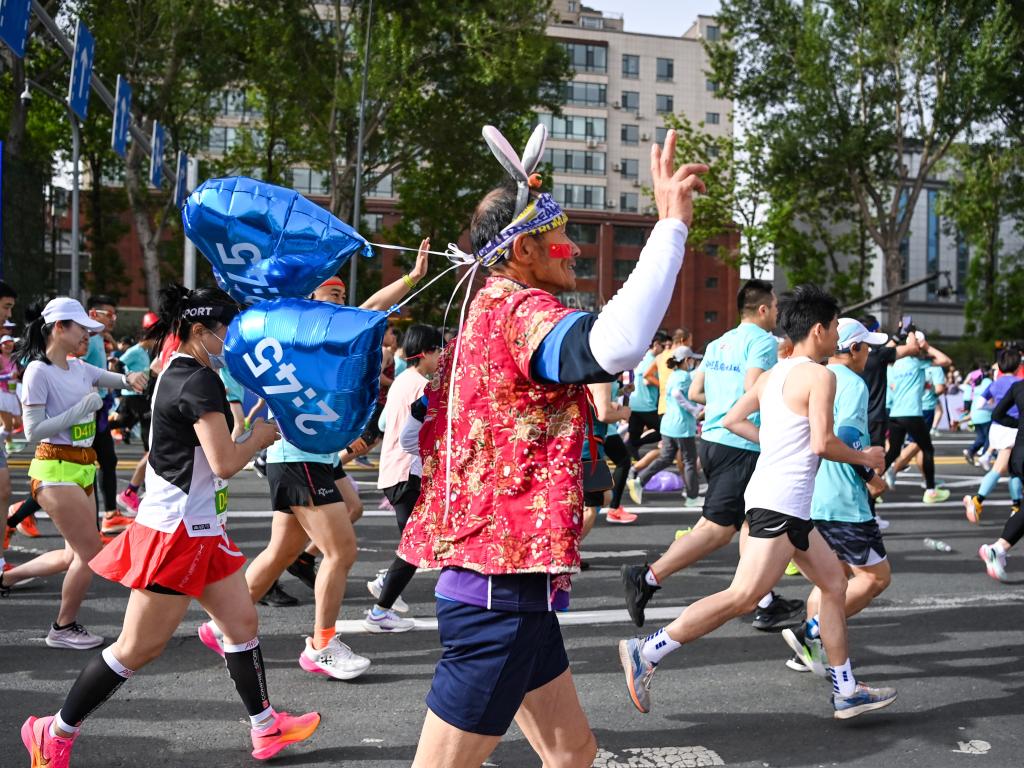 这样的日子里,参赛的选手中不乏热爱健身的情侣,他们成双成对地出发,更凸显出赛道上独自奔跑的奚占玉。后者将近70岁,身材削瘦,头上戴着的兔耳朵是这次马拉松比赛中“兔子”选手的标配,并不奇怪。但他身上略见破旧又过于贴身的那件花棉袄,在这个5月下旬的天气里格外显眼。