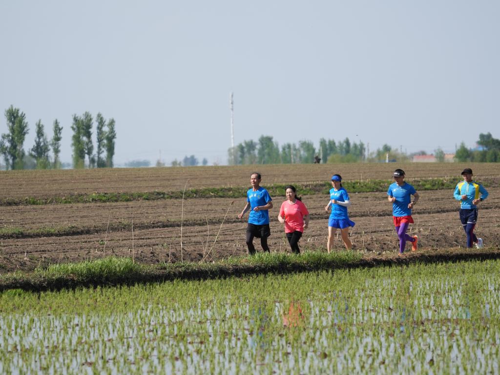 奚占玉带领附近热爱跑步的乡亲们在田间跑步