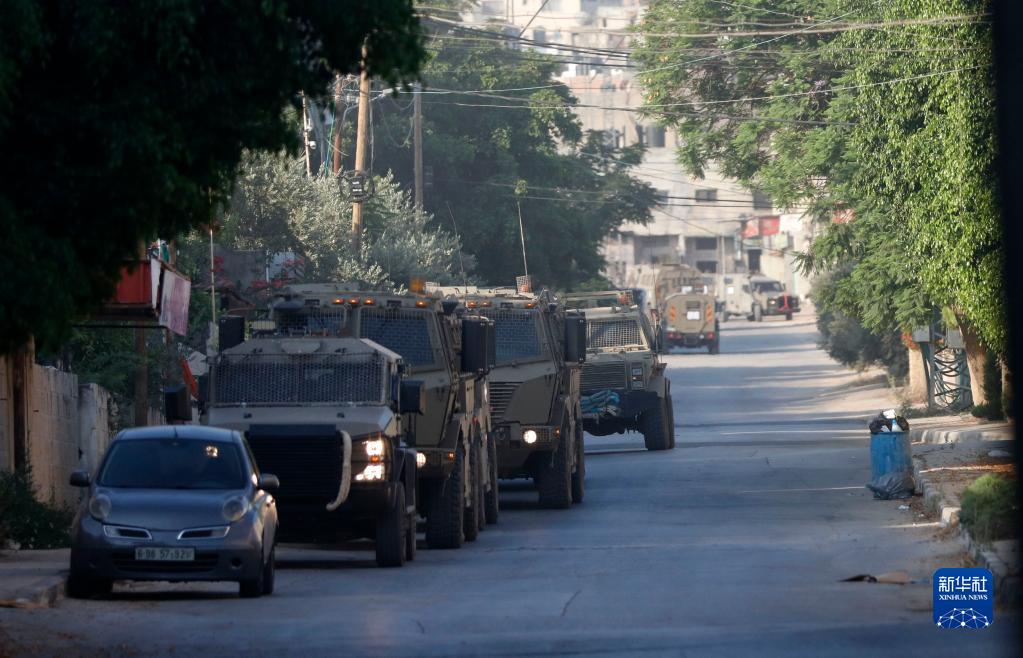 7月3日,在约旦河西岸北部杰宁地区,以色列军车从难民营附近驶过。新华社发(艾曼·诺巴尼 摄)