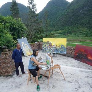 7月3日,来自深圳的画家李佳在洪江村自己打造的工作室外写生。