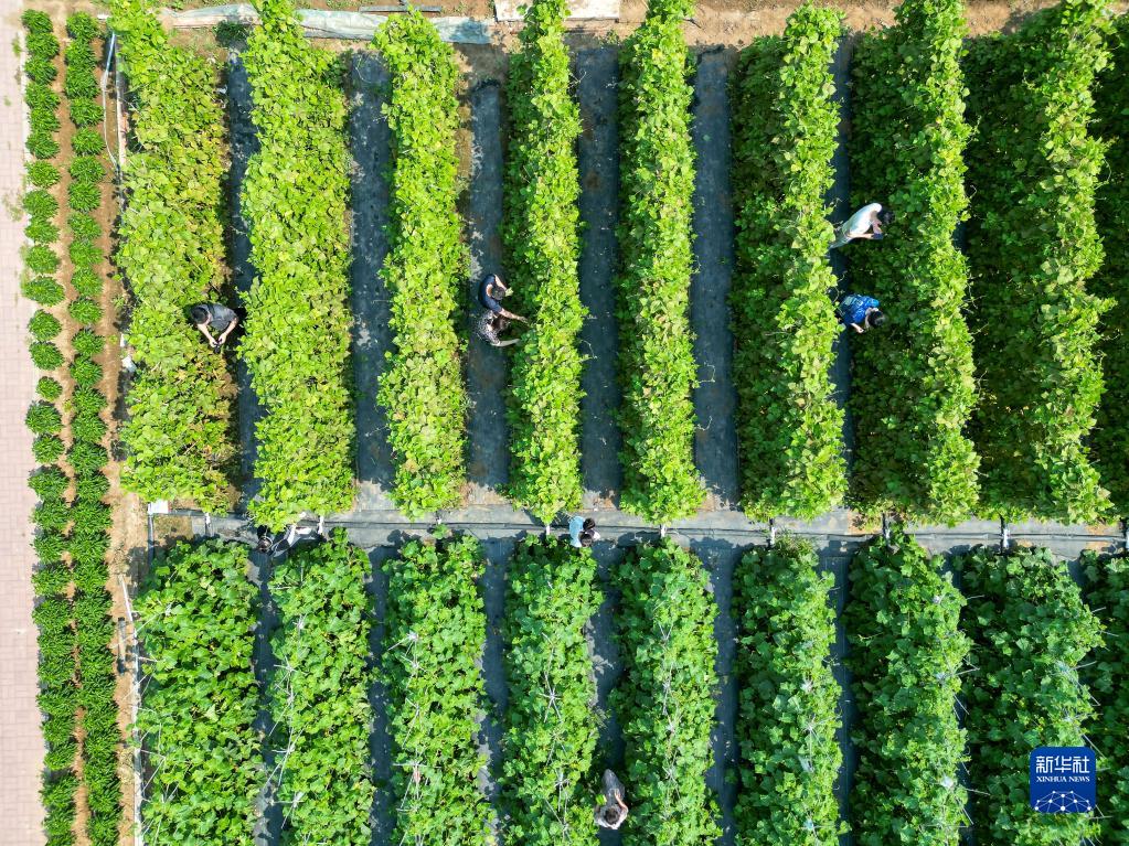 7月3日,市民在河北省唐山市路北区一处家庭农场内采摘(无人机照片)。