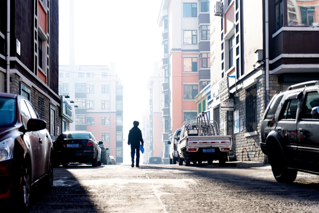 在黑龙江省七台河市桃山区,社区民警刘欣在管辖社区内巡逻(2022年1月9日摄)。新华社记者 谢剑飞 摄