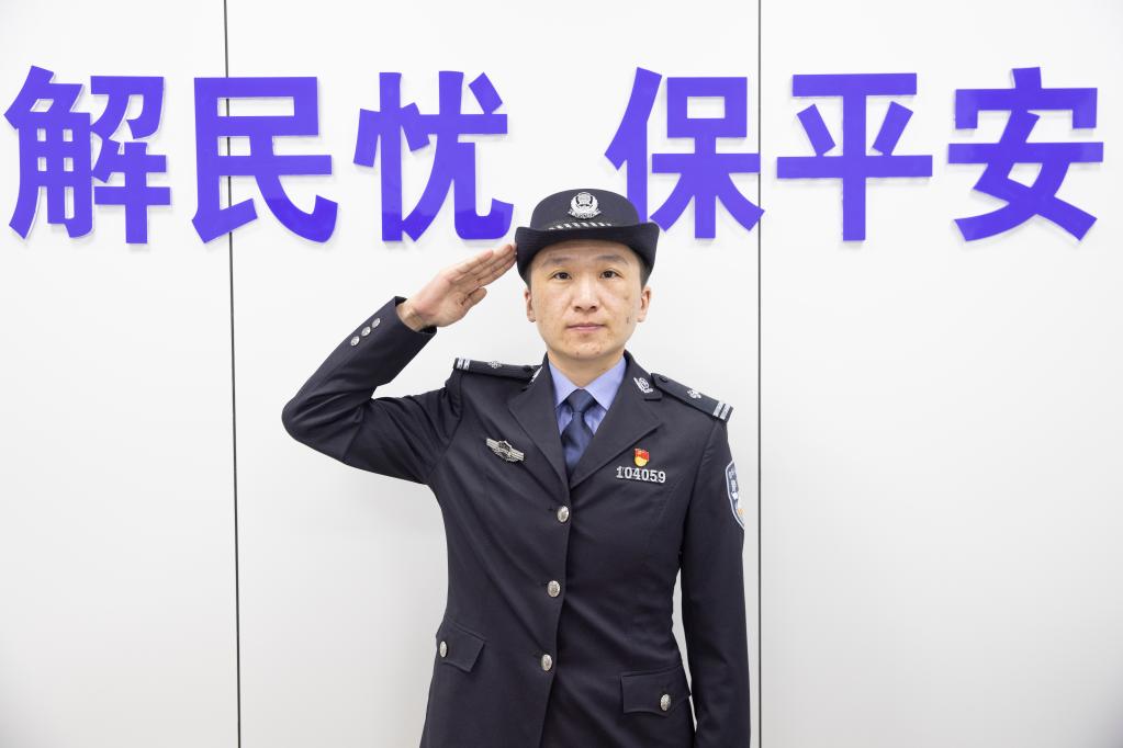 在七台河市桃山区,刘欣在警务室里敬礼(2022年1月9日摄)。新华社记者 张涛 摄