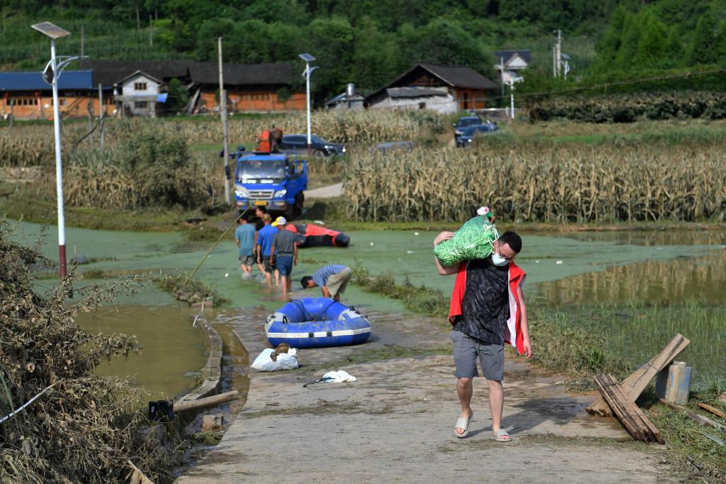 7月3日,在湖南湘西州保靖县阳朝乡猛科村,志愿者在搬运救灾物资。新华社记者 陈振海 摄