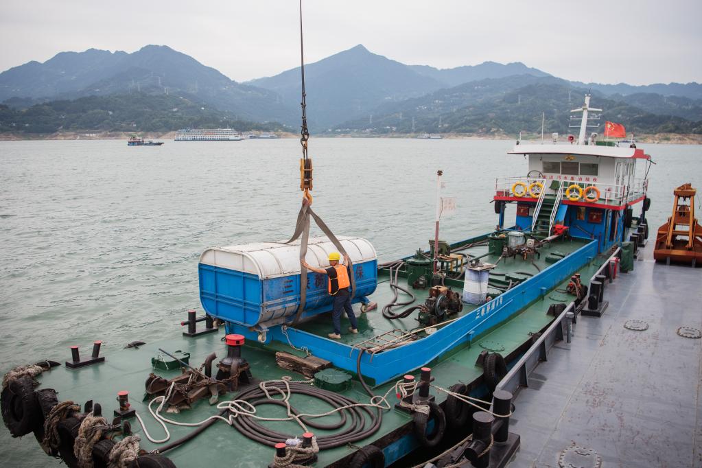 浮吊作业趸船对船舶生活垃圾进行接收转运处置。新华社记者伍志尊 摄