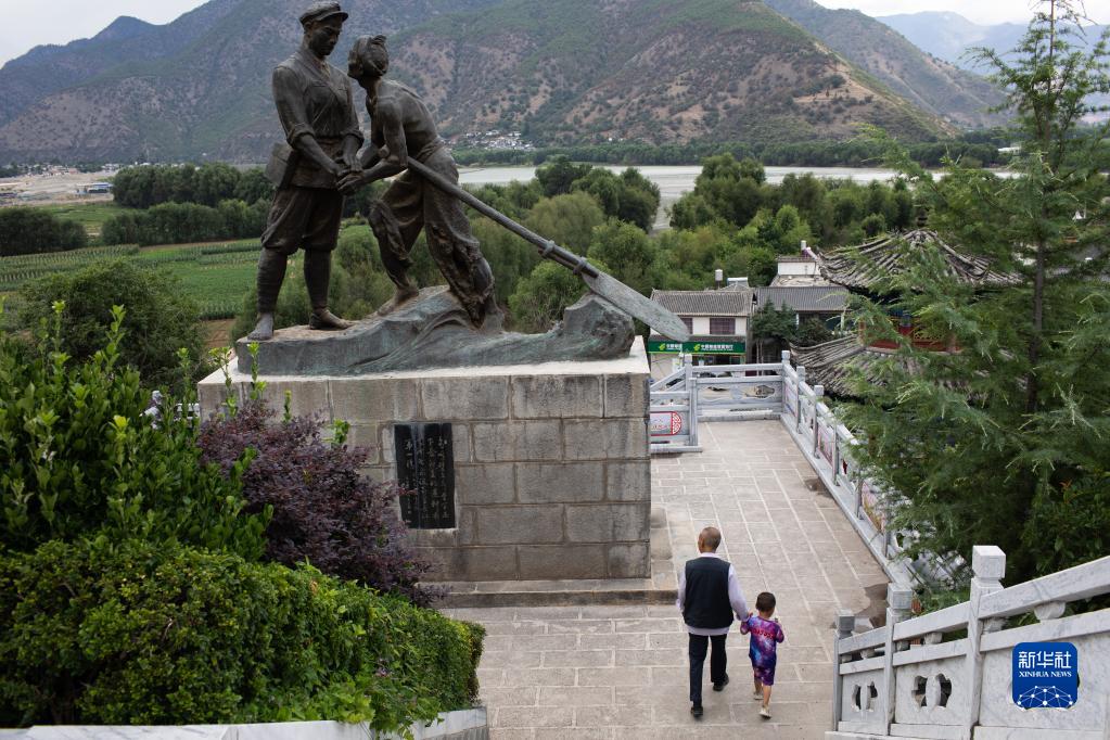 6月20日,在位于丽江市石鼓镇的红军长征过丽江纪念馆,66岁的退伍军人王自荣带着孙子走过“金沙水暖”雕塑。