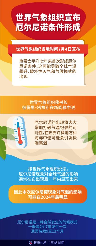 新华社日内瓦7月5日电 世界气象组织4日宣布,热带太平洋七年来首次形成厄尔尼诺条件,这可能导致全球气温飙升、破坏性天气和气候模式的出现。