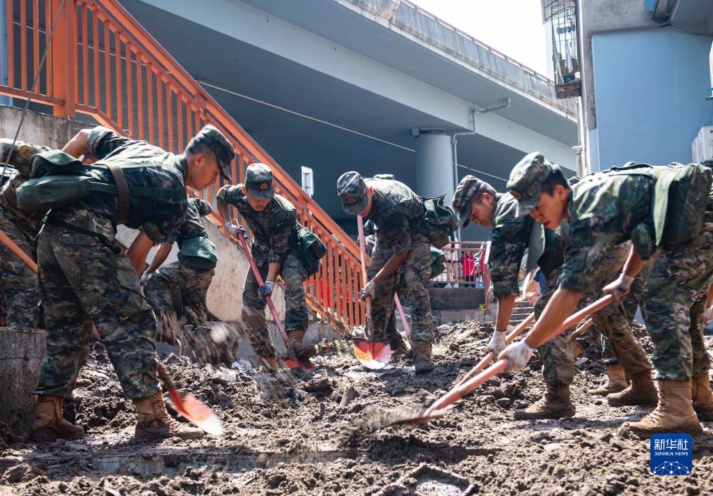 7月5日,武警官兵在万州区五桥街道受灾地区的街巷中进行清理作业。新华社发(冉孟军 摄)