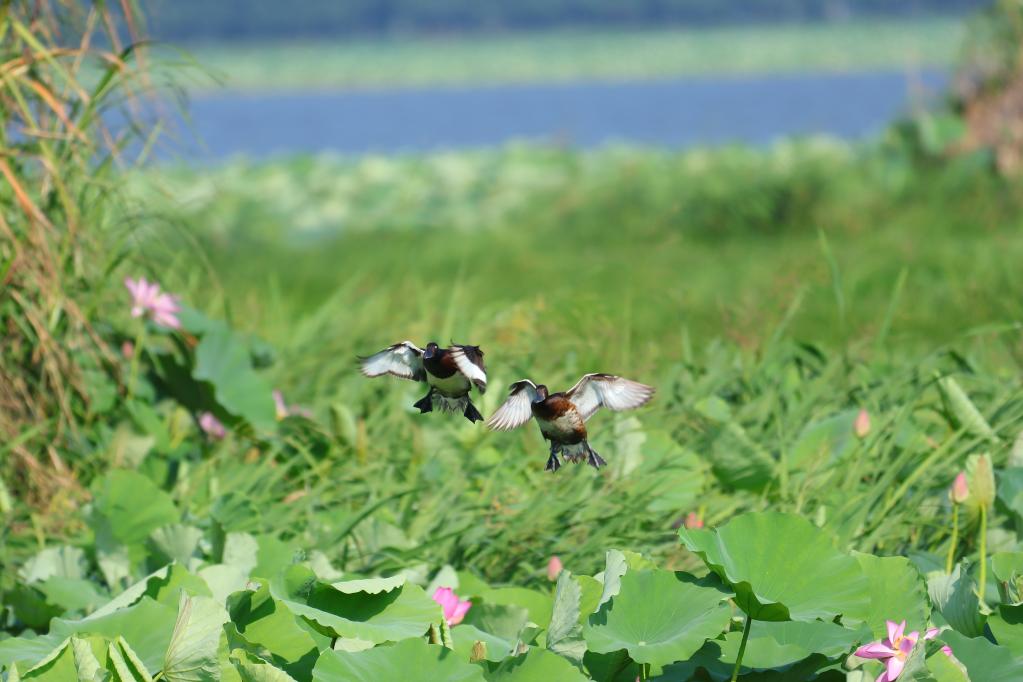 候鸟从崇湖湿地的荷塘中振翅飞起。(吴樊 摄)