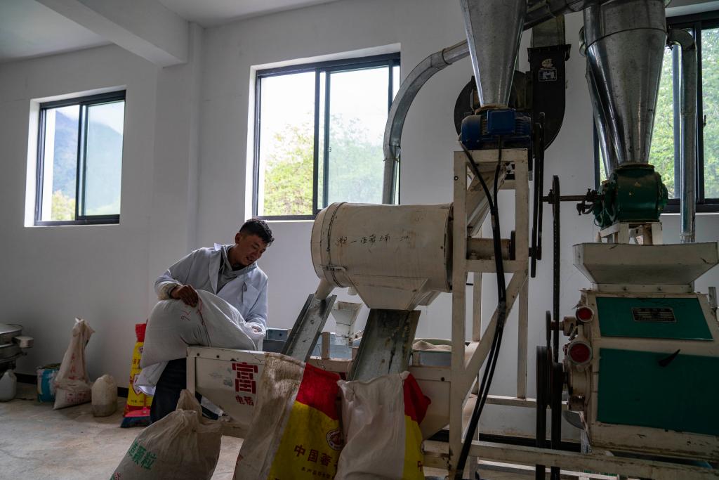 在吉巴乡吉巴村荞麦种植加工农牧民专业合作社,一名员工正在加工荞麦(6月27日摄)。新华社记者 孙非 摄