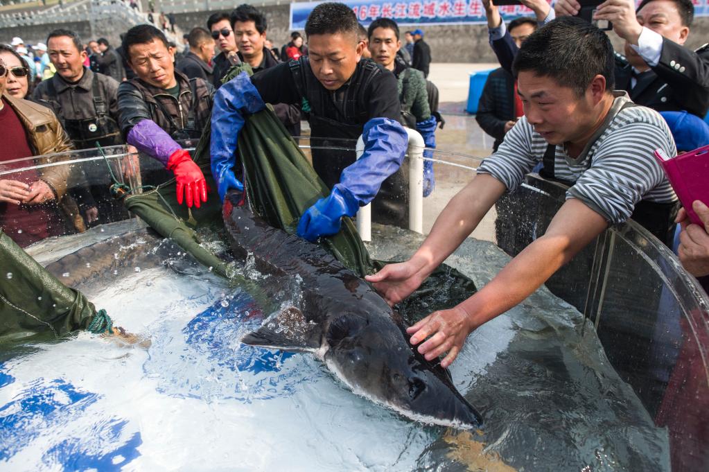 2016年3月1日,在湖北宜昌,工作人员准备将一尾中华鲟放流长江。新华社记者 肖艺九 摄