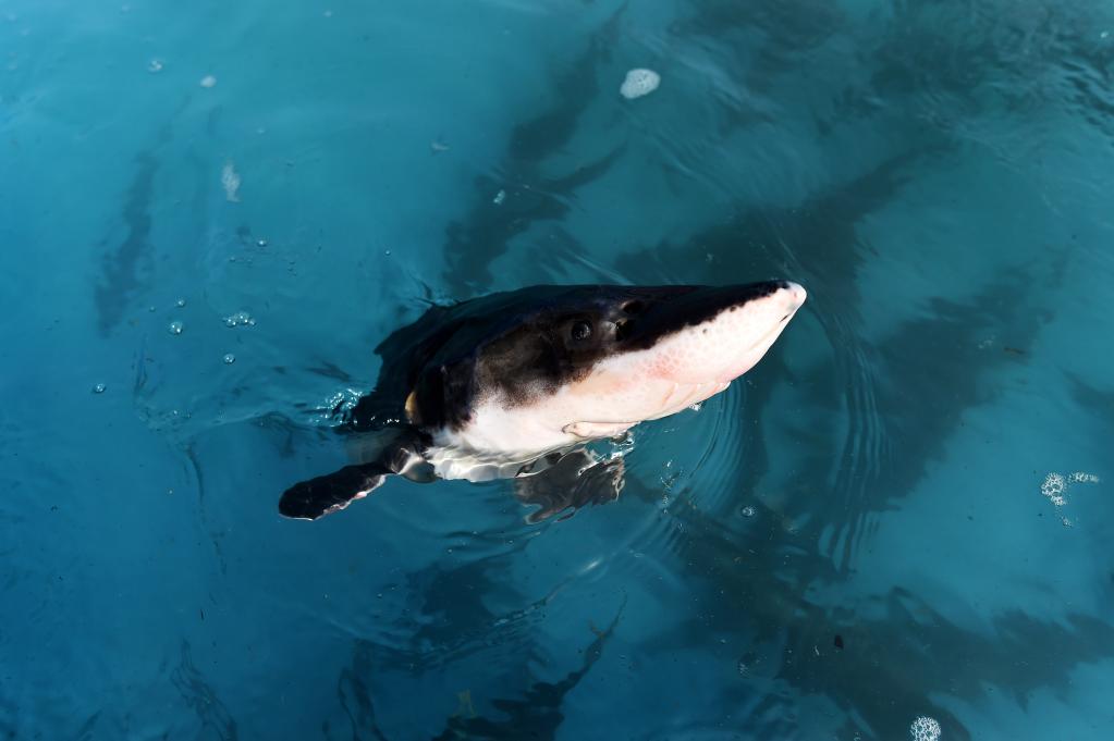 2019年4月13日,在湖北宜昌举行的“2019年长江三峡中华鲟放流活动”中,即将放流的中华鲟在水中游曳。新华社记者 肖艺九 摄
