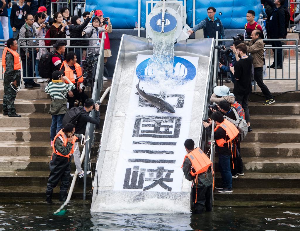 2019年4月13日,在湖北宜昌举行的“2019年长江三峡中华鲟放流活动”中,中华鲟从放流通道滑入长江。新华社记者 肖艺九 摄