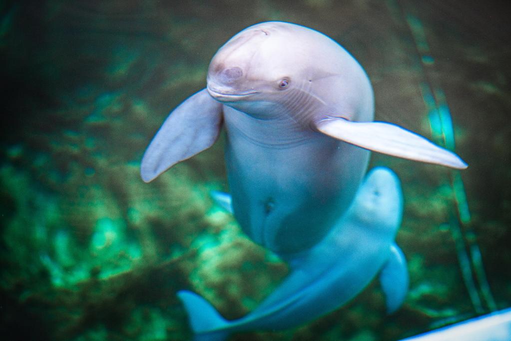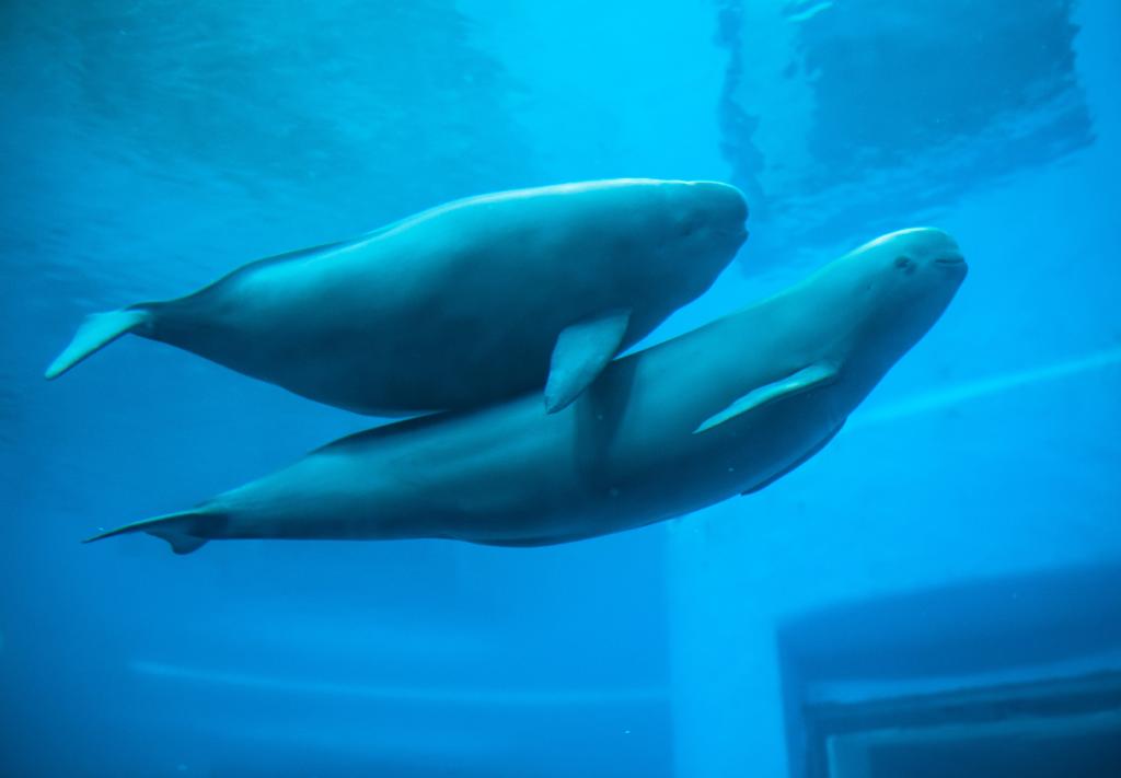 2021年7月5日,在中国科学院水生生物研究所白鱀豚馆里,一对江豚母子在水中游弋。新华社记者 肖艺九 摄