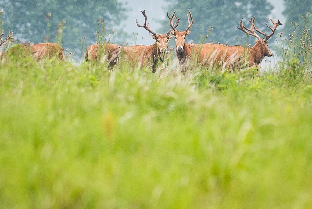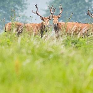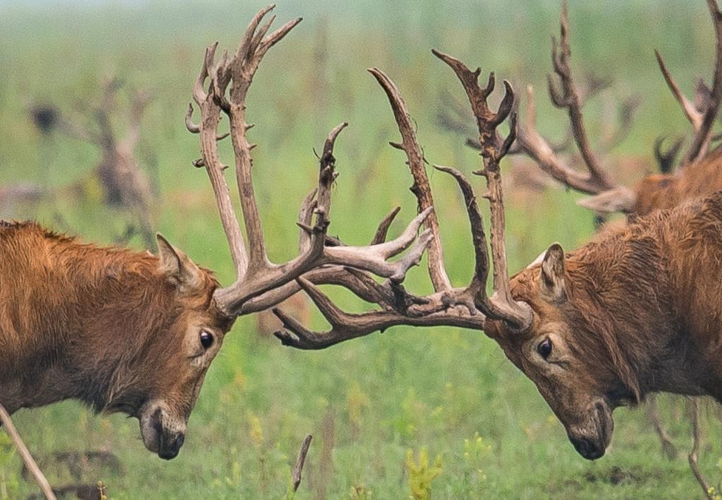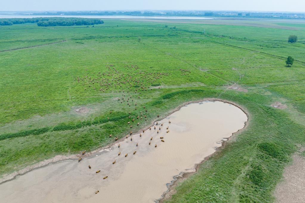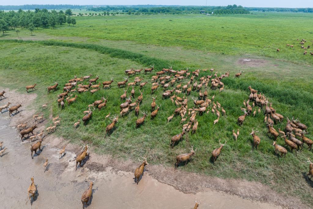 2023年5月19日,一群麋鹿在湖北石首麋鹿国家级自然保护区内活动。新华社记者 肖艺九 摄