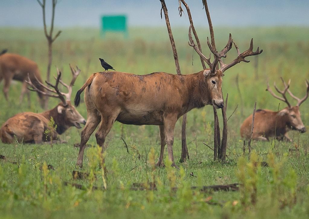 2021年5月17日,在石首麋鹿国家级自然保护区,一只鸟在麋鹿的背上驻足。新华社记者 肖艺九 摄
