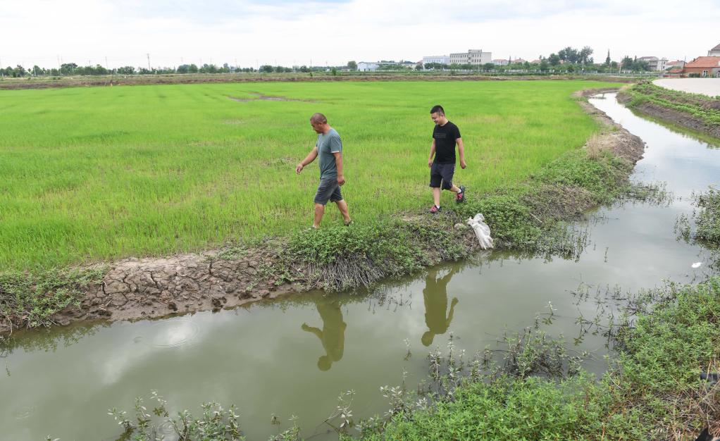 龙感湖示范区农场职工李迎月(左)在自家虾稻田旁察看水稻长势。新华社记者程敏 摄
