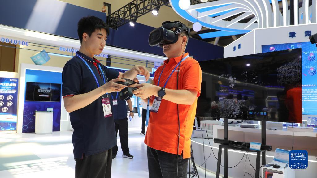 7月6日,在第二十九届中国兰州投资贸易洽谈会电子科技馆,参展商引导参会者体验VR产品。新华社记者 张智敏 摄