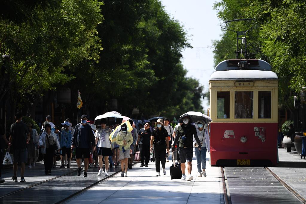 7月6日,不少游客撑伞行走在北京市前门大街。新华社记者鞠焕宗 摄