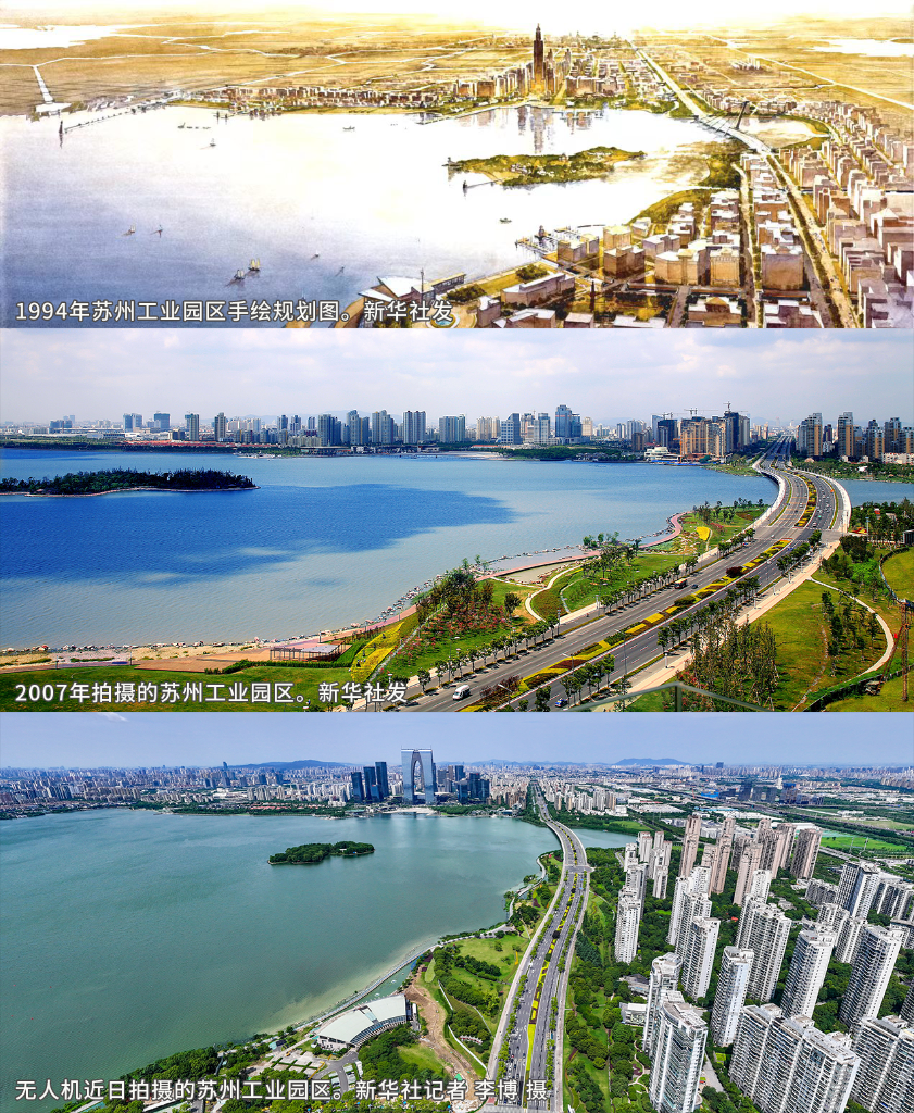 1994年,苏州工业园区经国务院批准设立,是中国和新加坡两国政府间的重要合作项目。如今,曾经的郊外水田鱼塘变身“产城人”一体的现代化园区,累计创造1.46万亿美元的进出口总值、1.03万亿元的税收。