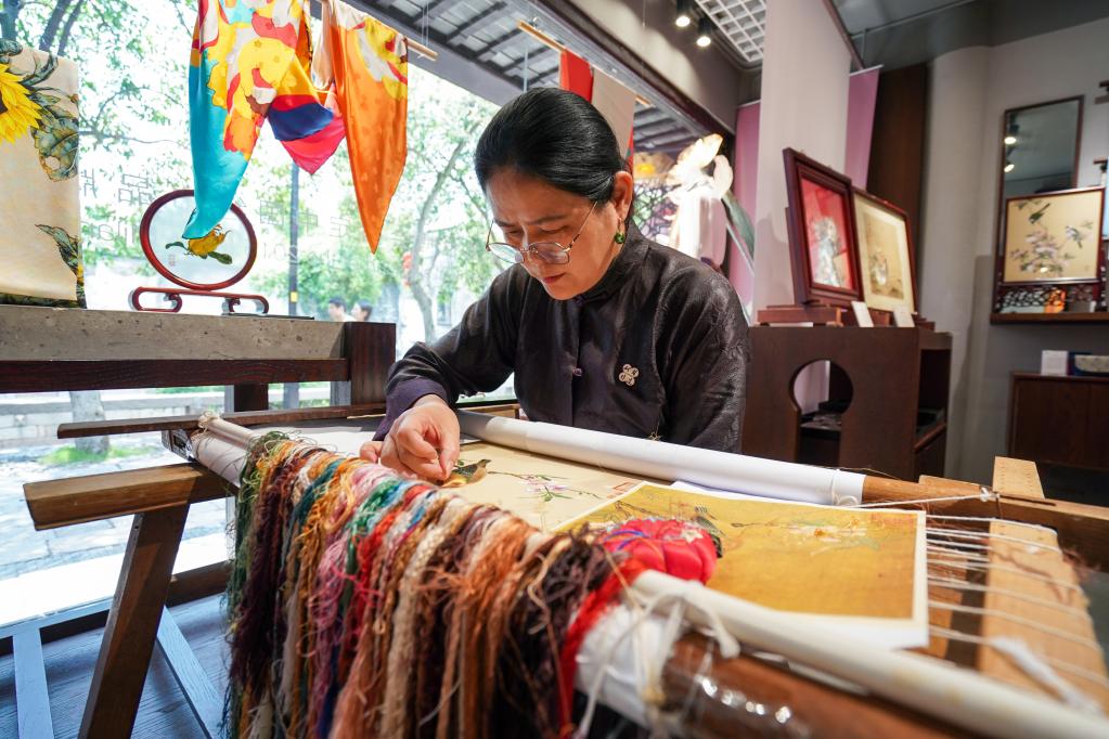一架绣绷、一缕丝线、一枚钢针,一袭旗袍的苏绣代表性传承人卢建英,7月6日上午,在苏州平江路一间小店里,埋首锦缎上手指翻飞,仿佛要将满头青丝也绣进作品里。