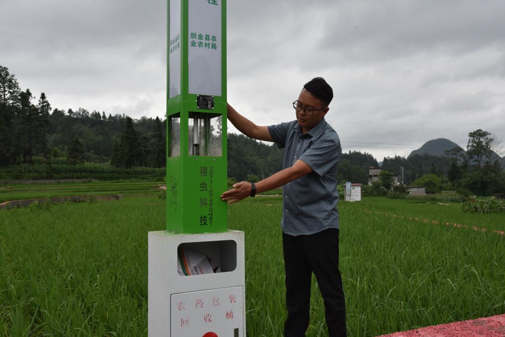 贵州织金县牛场镇后坝村投用绿色防控杀虫灯,以减少稻田虫害的发生。新华社记者李凡 摄