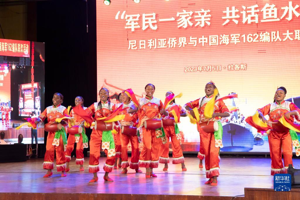 7月5日,在尼日利亚拉各斯,当地艺术团体在中国编队官兵代表与华人华侨共同参加的联欢活动上表演。新华社发(吴亢慈 摄)