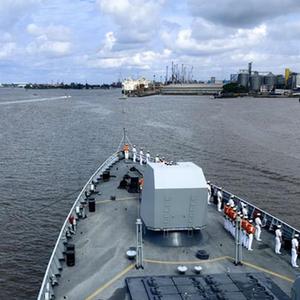 6日9时许,编队圆满完成对尼日利亚友好访问驶离拉各斯阿帕帕港,中尼代表100余人在码头为编队送行。离港后,编队舰艇与尼日利亚海军“卡诺”号、“伊贝诺”号巡逻舰等舰艇进行了反恐反海盗、联合搜救、编队分航等课目演练。
