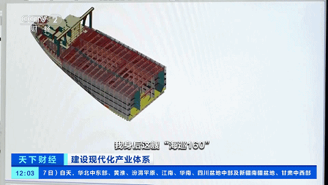 中国船舶江南造船数字化设计主管 王杰:我身后这艘海巡160,是第一艘无纸化建造的船舶。使用了三维模型技术,所以它的整个制造工时缩短了60天。