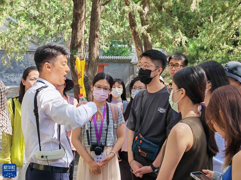 参加台胞青年夏令营的青年在北京市颐和园内聆听讲解员讲解(7月7日摄)。 新华社记者 赵欢 摄