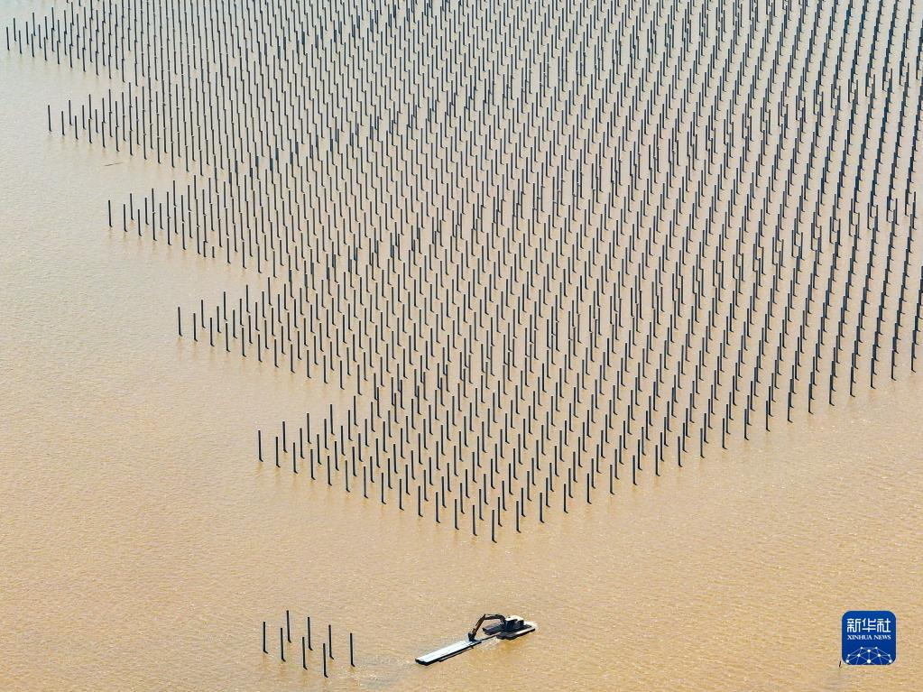 7月6日,在浙江省温岭市东部松门滩涂光伏电站项目建设现场,施工机械在拖运建材物料(无人机照片)。