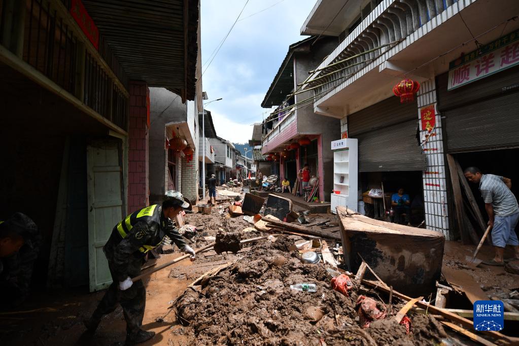 7月2日,在湖南省湘西土家族苗族自治州古丈县岩头寨镇草潭村,当地应急民兵协助村民清理淤泥和垃圾。